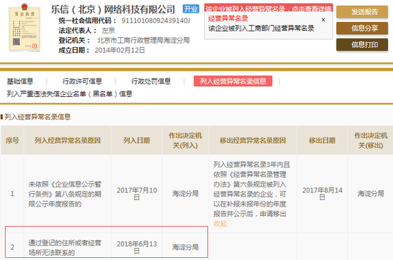 工商公示信息显示,从2017年7月10日至2018年6月13日不到1年的时间里,乐为金融两度被列经营异常名录。而最近的一次至今尚未移出。