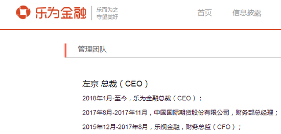 亚洲财经近日登陆乐为金融官网管理团队一栏发现,乐为金融总裁(CEO)一职显示为左京,其出任时间为2018年1月。