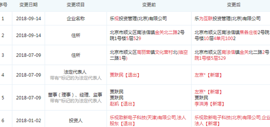 据乐为金融网站介绍,乐为金融成立于2014年2月12日,注册资本和实缴资本均为1亿元。公司唯一股东为乐视投资管理(北京)有限公司,占股比例100%。企查查显示,乐视投资管理(北京)有限公司已于今年9月14日更名为乐为互联投资管理(北京)有限公司,该公司法人也于今年7月9日由贾跃民(贾跃亭的哥哥)变更为左京。