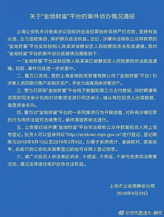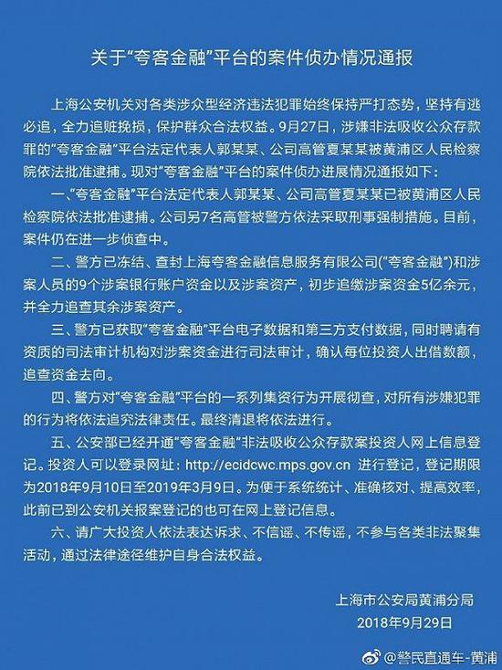 9月29日,为全力做好追赃挽损工作,保护群众合法权益,上海经侦通过“警民直通车-黄浦”、“警民直通车-浦东”、“警民直通车-静安”三个官方微博对“夸客金融”、“魔袋金融”、“金坳财富”共三家平台案件的最新进展情况进行通报。