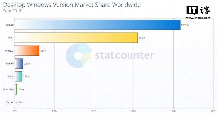 IT之家10月2日消息 根据最新的StatCounter报告,微软Windows 10的全球市场份额从48.19%增加到了50.07%,而Windows 7系统从9月份的38.65%降至37.2%。