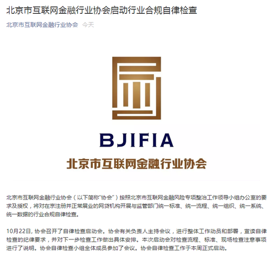 新浪科技讯 10月22日下午消息,北京市互联网金融行业协会在其官方微信公众号发布声明称,10月22日, 协会召开了自律检查启动会。将对在京注册并正常展业的网贷机构开展与监管部门统一标准、统一流程、统一组织、统一系统、统一数据的行业合规自律检查。