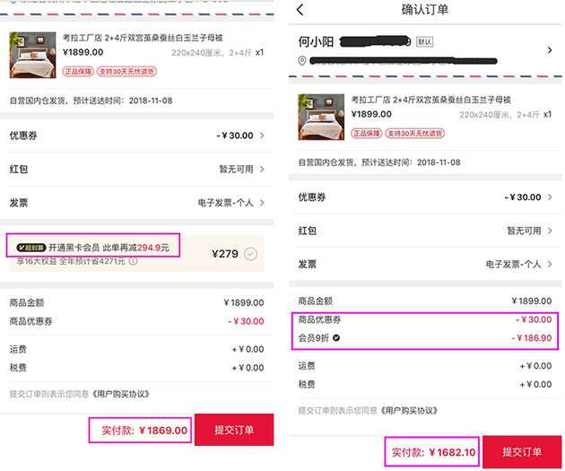开卡前后订单优惠额对比、以及何小阳购买黑卡会员付款单。图片显示,购买黑卡会员卡前,此单再减294.9元,实际开通后,下单只能优惠216.9元。(图片由何小阳提供)