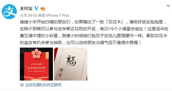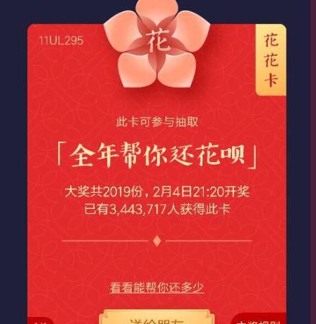所有集五福的方法,都有可能获得“花花卡”哦。获得“花花卡”的小伙伴们,可以参加支付宝帮还全年花呗的机会哦!没得到“花花卡”的小伙伴也别着急哦,毕竟才两天嘛!还有好多天呢,加油哦!当然,除了福卡,也有机会获得淘宝的其他奖品哦!