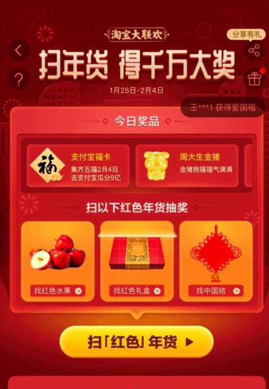 进入淘宝,输入“五福”,可以进入淘宝''扫年货、中大奖''的界面。在这个界面中,扫红色年货、红色水果、红色中国结,有机会得到副卡哦。但是这个不是百分百哦!