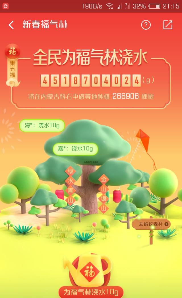 开通了蚂蚁森林的朋友们,进入蚂蚁森林界面,点左上方的“福气林”小图标,就可以浇水领福卡了!给“福气林”浇水,每天至少可获得2张福卡哦!