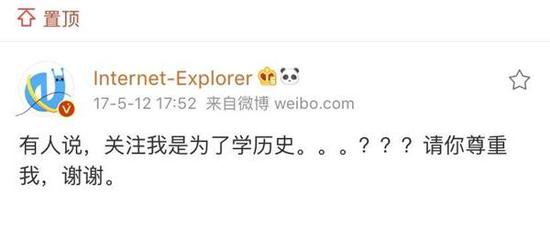 置顶的一条微博是:‘有人说,关注我是为了学历史。。。???请你尊重我,谢谢。’微博上还有一个 Chrome-Google 浏览器的账号,每天的日常就是怼 IE,置顶的一条微博是:‘有人说,我们产品最大的敌人是 @Internet-Explorer ???请你尊重我,谢谢。’