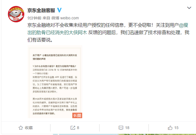 上线”图片助手”小功能原本是希望优化用户体验,但是却给用户带来了不良感受。我们向大侠阿木的监督表示感谢,也对广大用户致以歉意。京东金融App目前已暂时下线”图片助手”小功能,待进一步改进用户安全体验后再上线,也欢迎广大用户继续用最严格的标准监督我们。