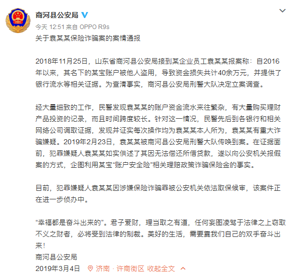新浪科技讯 3月4日下午消息,山东警方发布案情通报称,袁某某谎称其支付宝被盗40万并报假案,目前已因涉嫌保险诈骗罪被公安机关依法取保候审。