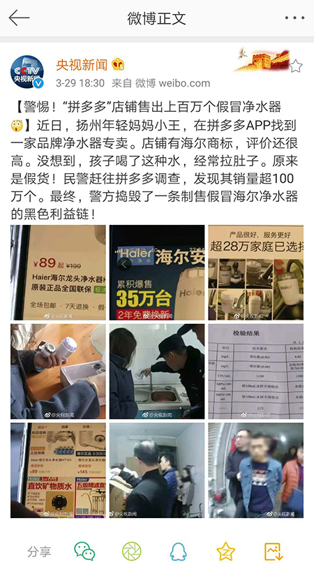 央视新闻微博端近日再次曝出“拼多多”平台店铺大规模制售假冒伪劣家电产品新闻。微博“@央视新闻”称,“近日,扬州年轻妈妈小王,在拼多多APP端找到一家净水器品牌专卖。店铺标有‘海尔’商标,评价也很高。但孩子喝了这种净水器过滤的水后,经常拉肚子。最终,证明该产品是假货。经民警调查,该产品销量超一百万个。最终,警方捣毁一条制售假冒海尔净水器的黑色利益链。”