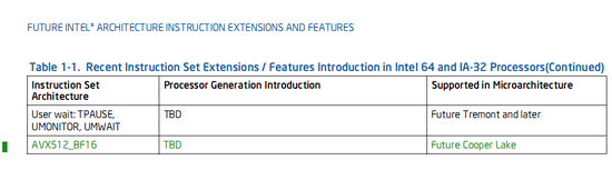 但这次,AVX512-BF16指令的支持架构却只写着“Future Cooper Lake”,并没有看到惯例的“and later”。