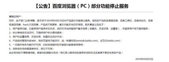 新浪科技讯 4月26日上午消息, 今日,百度浏览器在其官方网站发布公告称,由于部门业务调整,官方将于2019年04月30日对产品部分功能停止服务。