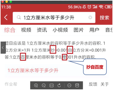 百度还举例称,在今日头条搜索“1立方厘米水等于多少升”,首条搜索结果中,嵌入了“抄自百度”的字眼,这也被看做是头条“盗窃”行为直接曝光的证据。不过,全天候科技今日再搜索的时候,已经搜不到类似内容。