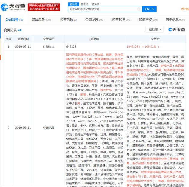 北京百度工商变更:注册资本增加70亿 向海龙卸任监事