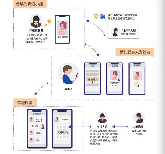 报告指出了色情诈骗的主要方式。即利用男性独自在外居住酒店时易出现的“招嫖”心理,通过技术手段设置“桃色陷阱”,欺骗被害人先交钱再提供“服务”,诈骗金额较小,从200 元到2000元不等。被害人即使识破骗局,也会因为金额较小,且紧张、羞愧又不愿意声张而不敢报警。此类诈骗作案门槛低,作案工具成本低廉,仅需一台手机,就可随时随地作案,可以一人单独作案或多人共同作案。