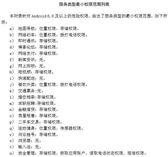 另外针对安卓6.0系统及以上的危险权限,草案也给出了各种服务类型的最小权限范围,如网络约车有位置权限、拨打电话权限;新闻资讯和网上购物则无权限;短视频有存储权限;运动健身有位置权限何传感器权限;安全管理则有存储权限、获取应用账户、读取电话状态权限、短信权限等。
