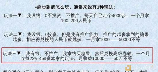 宣传广告上称,在一分钱不投入的情况下,只要每天揣着手机开着软件走3000步,就可在一年后获得55个糖果,而当时每个糖果价值100元,轻松实现年赚五千的目标。而且其上不封顶,甚至说最高能月入2万块。