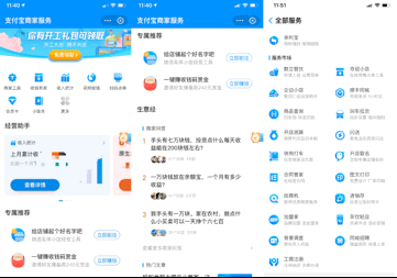 在支付宝的商家服务板块,小微商家可以在平台上获得由起店名、品牌加盟到员工招聘、工商注册、合同管理在内的一系列商家服务。更重要的是,商家在支付宝平台上的数字经营行为,可以为自己带来更多流量,也有机会帮助自己获得来自网商银行的贷款融资服务。