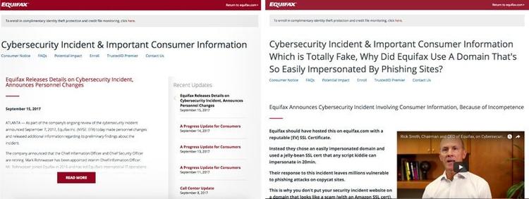 Equifax 为用户信息泄露事件建立的网站(左)和假的网站(右)。一名软件工程师创建了该虚假网站,希望Equifax 的网络安全漏洞能引起关注。