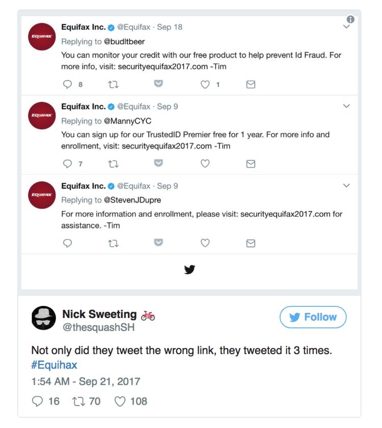 Equifax 就犯了这样的错误。最近,软件工程师尼克·斯威廷(Nick Sweeting)仿冒 Equifax(一家美国信用报告公司,译注) 官方网页建立了一个虚假网站 securityequifax2017.com。但实际上,正确的网址应为 equifaxsecurity2017.com,它是 Equifax 为此前的信息泄露危机新开设的网站,这起事件或已导致 1.43 亿美国人的信息外泄。然而,Equifax 的 Twitter 账号竟然推送了多条消息,把假的钓鱼网站地址发给了消费者。乌龙事件公开后,他们才删除了这些消息。